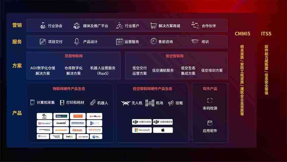 聚合国内外先进的物联网硬件产品品牌,,,,聚焦数字化仓储、、、、机器人运营、、低空智联网等领域,,,共同打造适合客户业务场景的解决方案并提供交付服务
