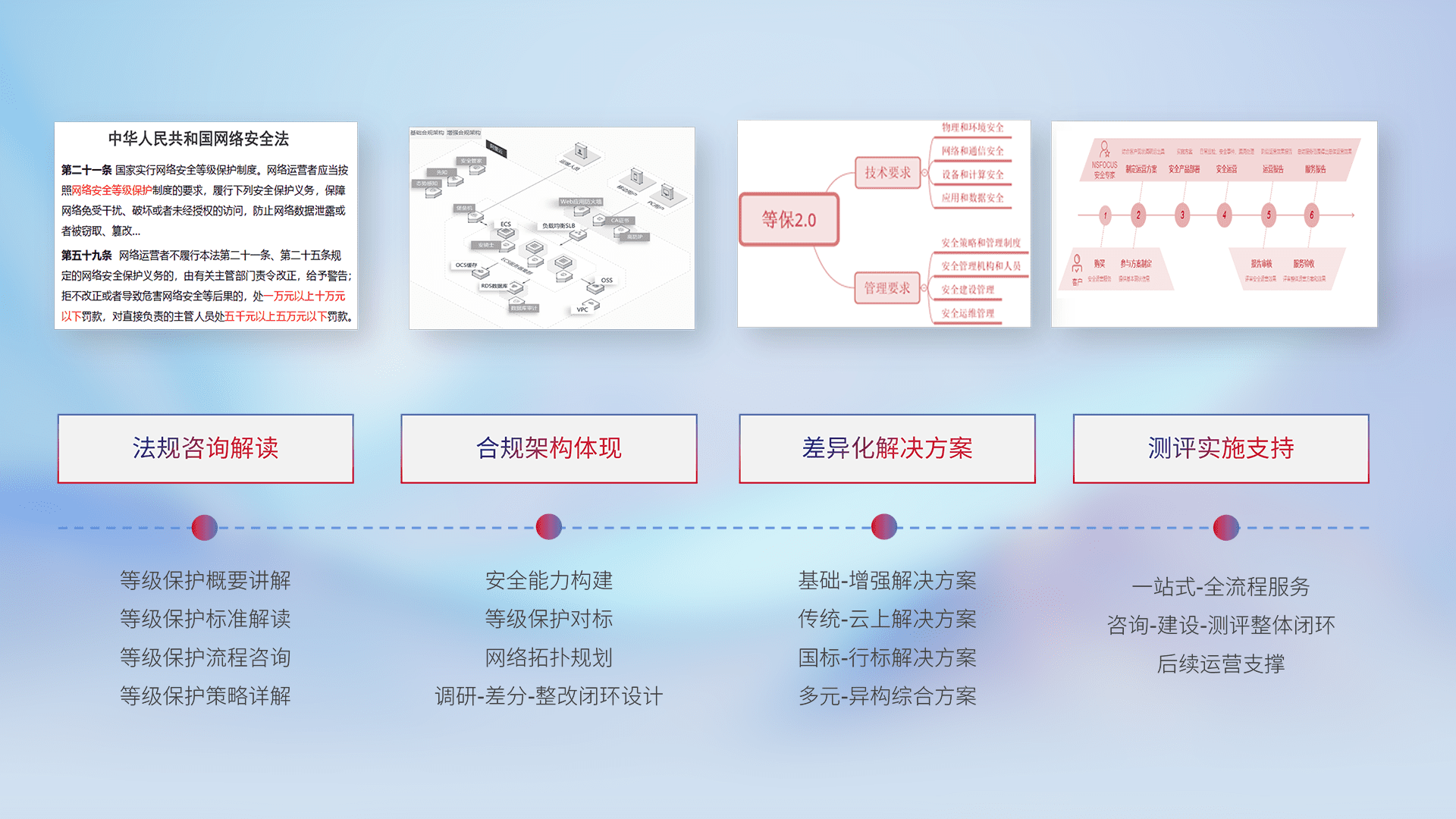 通过专业的法律咨询解读、、、合规架构体现、、、差异化解决方案、、、、测试实施支持等服务,,为客户量身打造等保合规体系。。。